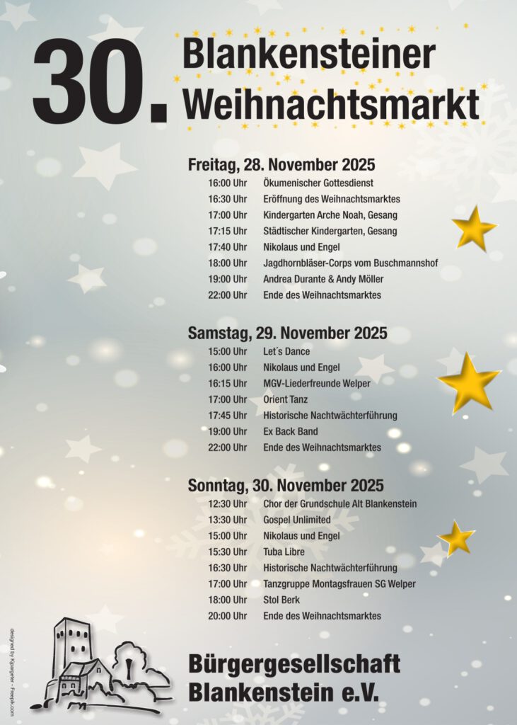 Die Bürgergesellschaft Blankenstein e.V. lädt alle Bürgerinnen und Bürger ein, den wie immer am 1. Adventswochenende stattfindenden Weihnachtsmarkt zu besuchen. Das wird in diesem Jahr vom 28.11. bis zum 30.11. und zum dreißigsten (30!) mal sein.